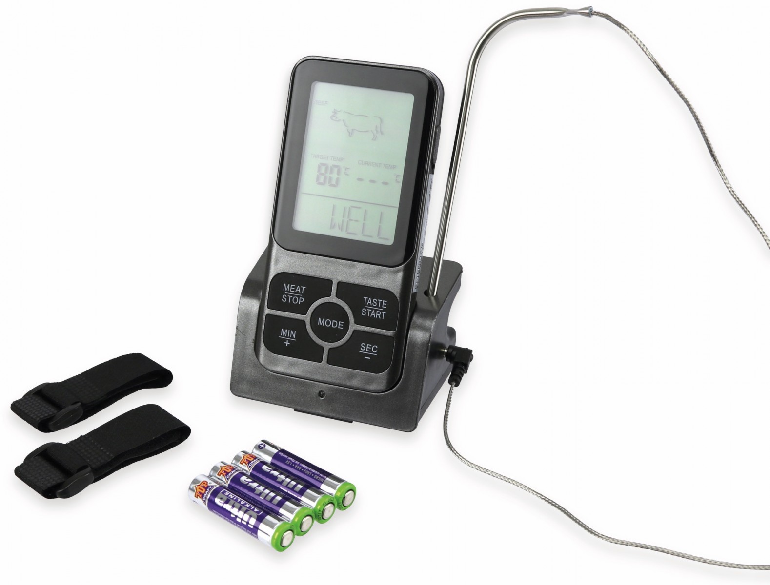 S týmto teplomerom dosiahnete pri grilovaní najlepšie výsledky vďaka optimálnemu sledovaniu teploty mäsa. S funkciou časovača, alarmom, ako aj predprogramovanými druhmi mäsa a úrovňami varenia. Veľký LC displej s červeným podsvietením. Zobrazenie aktuálnej a cieľovej teploty. Teplota v °C alebo °F.