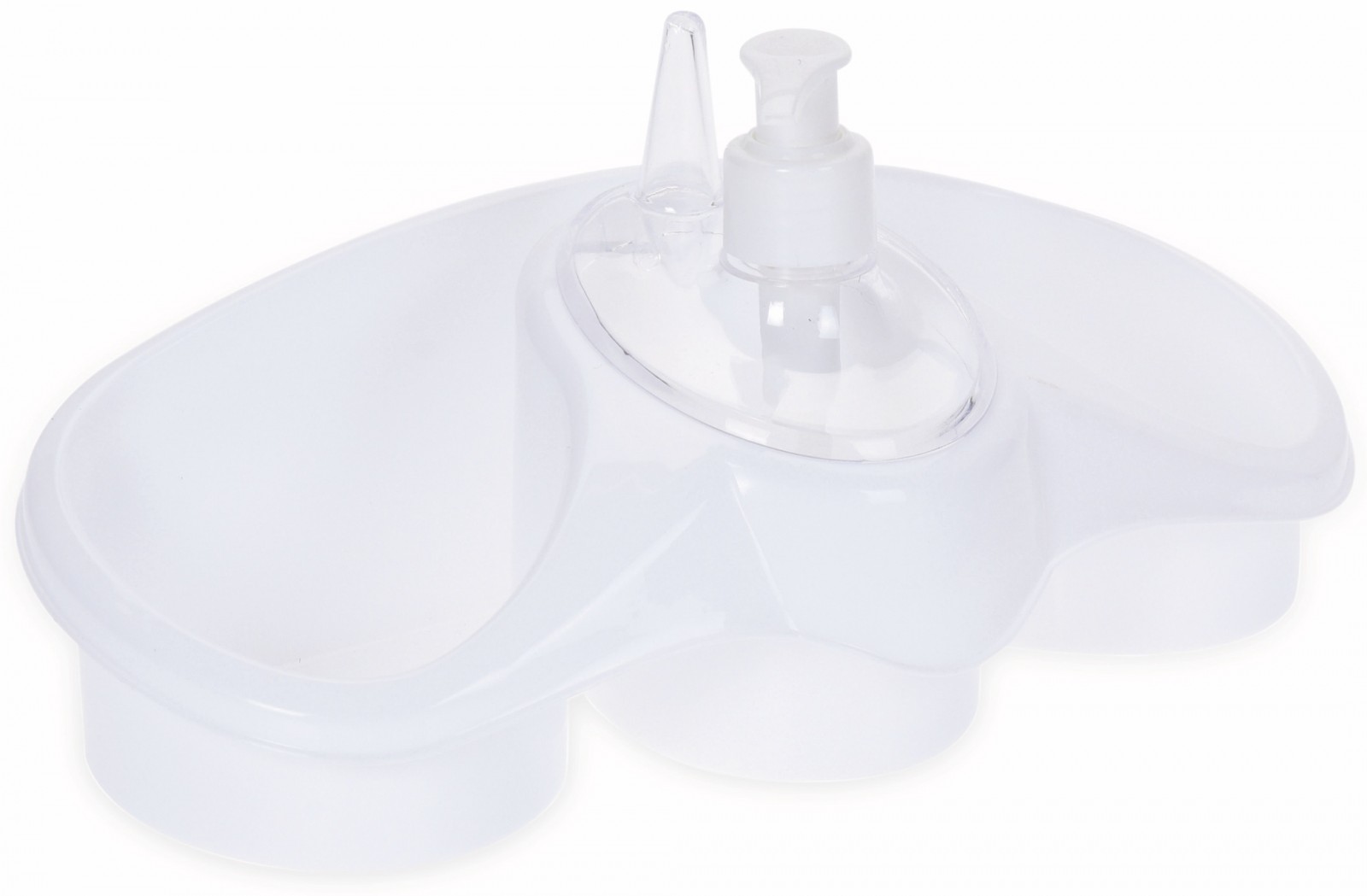 Tento praktický organizér na umývadlo sa skladá z plniteľného dávkovača mydla s miskou.