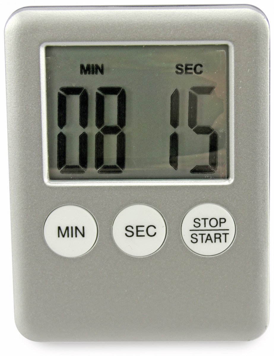 Tlačidlo START/STOP;hlasité pípnutie;4-miestny veľký displej;programovateľné až na 99minút a 59sekúnd pomocou 3tlačidiel;farba: strieborná;batéria 1xAG10(súčasť balenia);Rozmer (DxŠxV):70x50x8mm