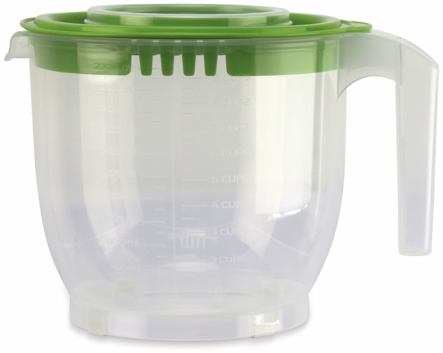 Vhodné do umývačky riadu do +95°C;mrazenie do max -25°C;Objem:2,2l;Materiál:plast;Farba:transparentná/zelená;rozmer: (ØxV):160x150mm