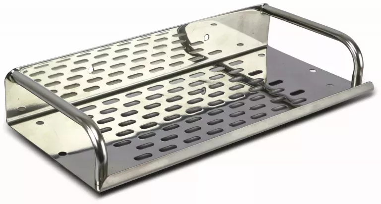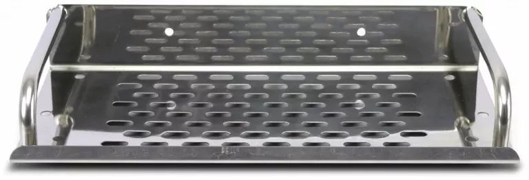 Nerezová polica vo vysokom lesku s perforovanou kovovou základňou, ideálna na odkladanie korenín, omáčok, byliniek, pohárov atď.