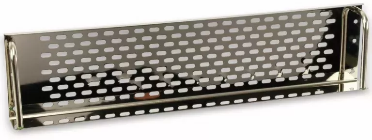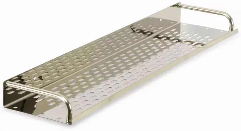 Nerezová polica vo vysokom lesku s perforovanou kovovou základňou, ideálna na odkladanie korenín, omáčok, byliniek, pohárov atď.