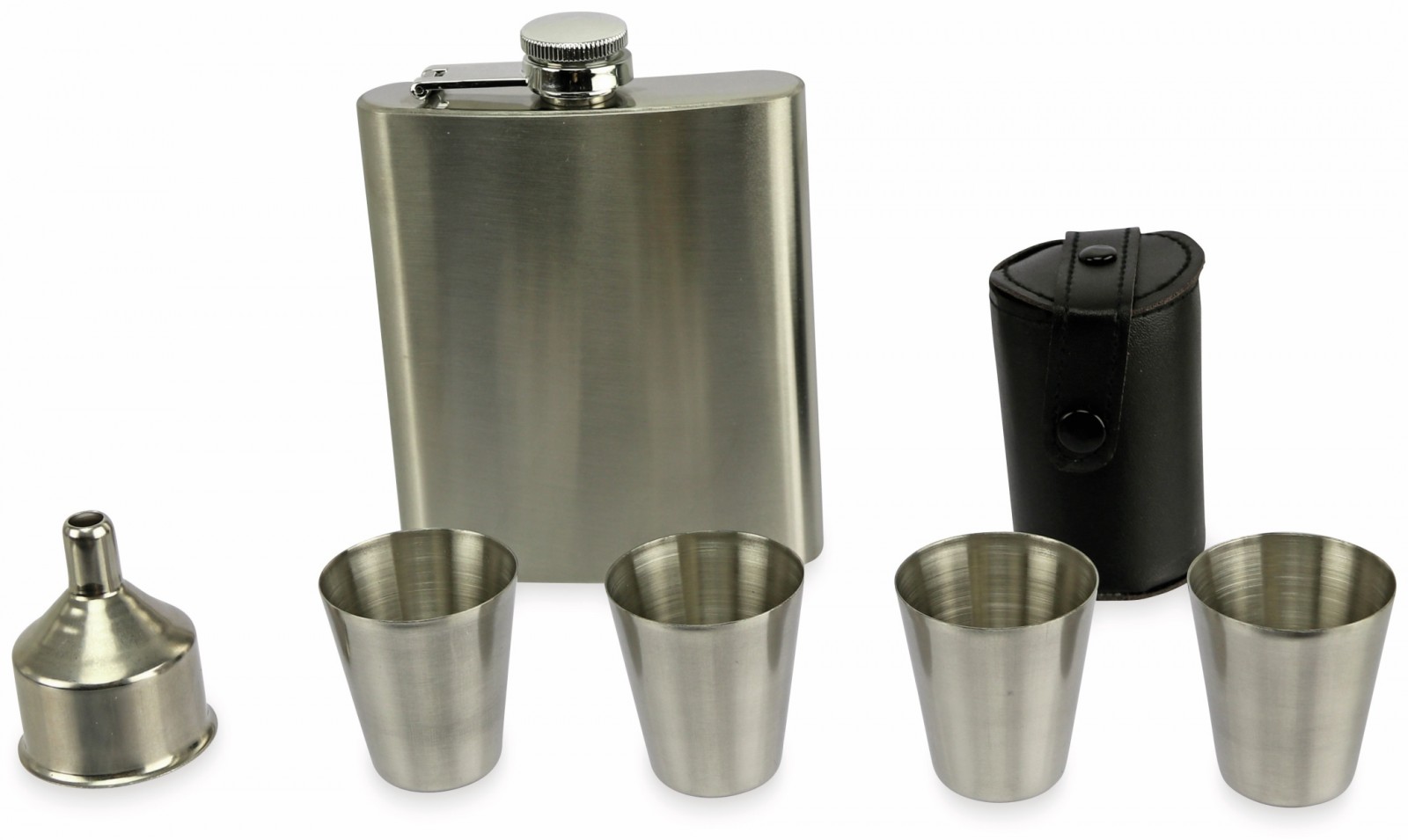 Ideálne na výlety, Sada obsahuje 1x ploskačku, 4x poharik, 1x praktické púzdro na poháriky, 1x lievik