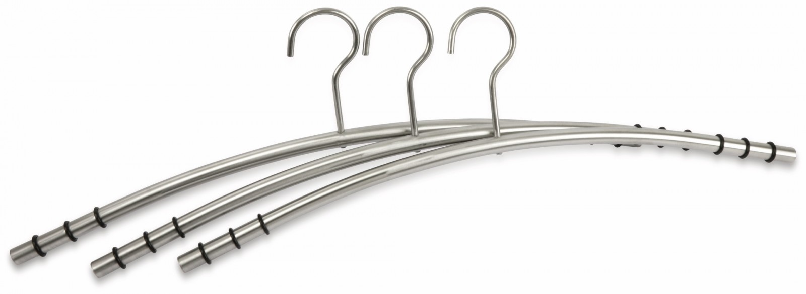 Ťažké vešiaky na šaty z nehrdzavejúcej ocele, matné brúsené. Vešiaky majú 3 gumenné krúžky v oblasti ramien, aby sa oblečenie nešmýkalo. Háčik na zavesenie je pevný, nie otočný