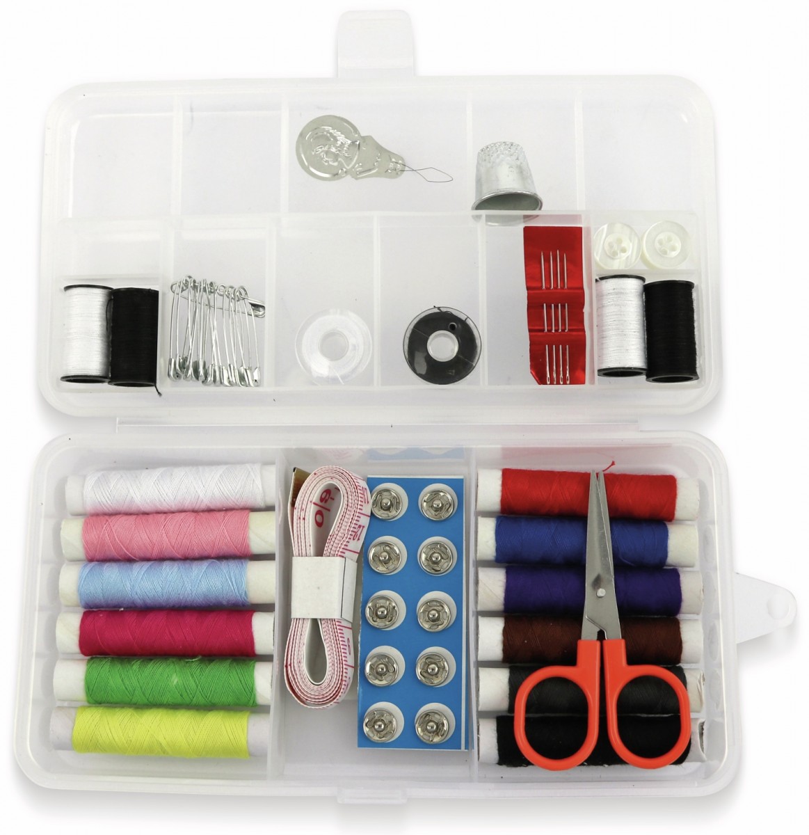 Súprava na šitie v priehľadnom boxe je vhodná na malé a rýchle opravy. Obsahuje špulky nití, šijace ihly, malé nožnice, gombíkmi, náprstok, krajčírsky meter, zatváracie špendlíky.