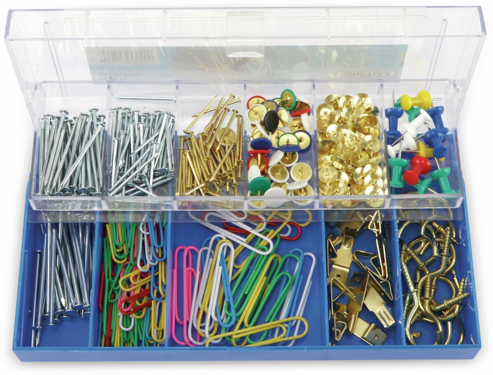 Obsahuje :špendlíky; 45ksx40mm;50ksx30mm;25ksx50mm;45ksx25mm(zlatá farba);pripináčik poplastovaný 35ks;pripináčik nepotiahnutý 35ks;10ks špendlík farebný;60ks sponka 27mm;25ks sponka 48mm;10ks háčik (na klinček);15ks háčik na skrutkovanie