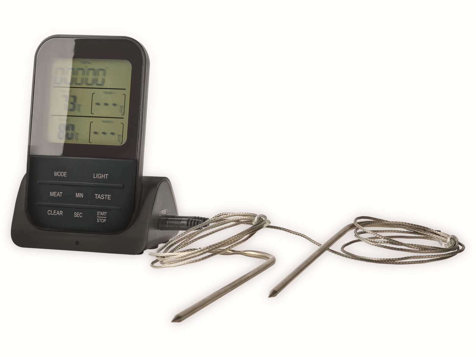 S týmto teplomerom dosiahnete pri grilovaní najlepšie výsledky vďaka optimálnemu sledovaniu teploty mäsa. S funkciou časovača, alarmom, ako aj s 8prednastavenými teplotami a stupňami varenia je skutočný pomocník v kuchyni. Má dve sondy (každá 1m), odnímateľné pre ľahké čistenie.Veľký LC displej s modrým podsvietením. Zobrazenie aktuálnej a cieľovej teploty. Teplota v °C
