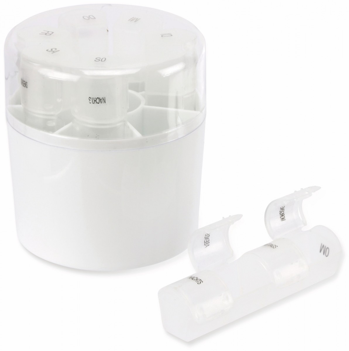 Organizér na lieky so 7 vyberateľnými samostatnými nádobkami na každý deň so 4priehradkami (ráno,obed,večer,noc). Vhodné na denné dávkovanie Vašich tabliet, vitamínov, atď. Vďaka priehľadnému vrchnáku a označeniu dňa v týždni máte po ruke tú správnu nádobku